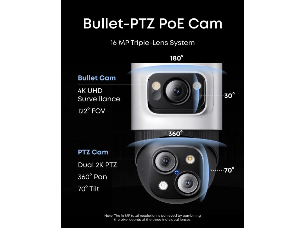 Objektiv a zorné pole: 16MP trojitý objektiv, 360° PTZ
