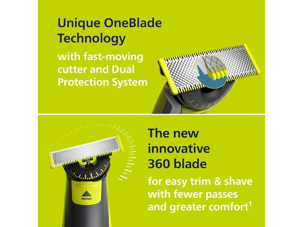 Jedinečná technologie OneBladePhilips OneBlade je vybaven revoluční technologií pro péči o pokožku tváře. Dokáže oholit vousy všech délek. Díky systému dvojí ochrany, hladké povrchové úpravě v kombinaci se zaoblenými hroty je holení snadnější a pohodlnější. Technologie holení představuje rychle se pohybující ostří (12 000 pohybů za minutu), které je účinné i pro delší vousy. |