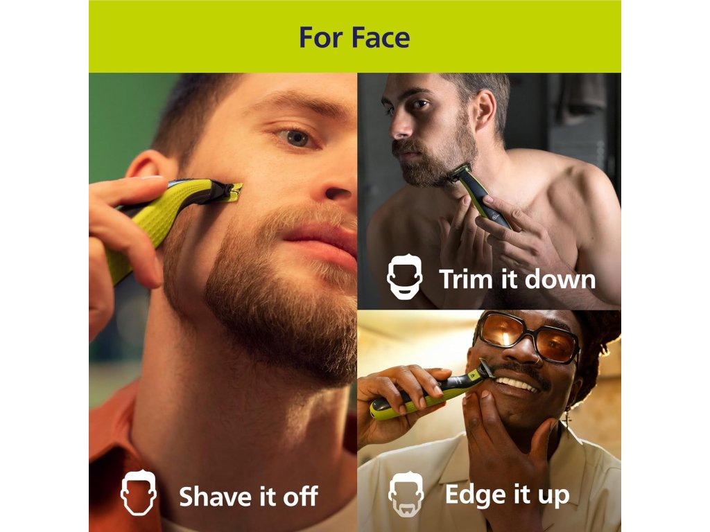Oboustranný břit: navržený pro přesné tahy a snadné ovládáníOneBlade kopíruje obrysy vaší tváře a umožňuje jednoduše a pohodlně zastřihovat a holit všechny části obličeje. Dodejte dvoustranným břitem svému vzhledu styl a pohybem břitu v kterémkoli směru vytvořte čisté linie. |