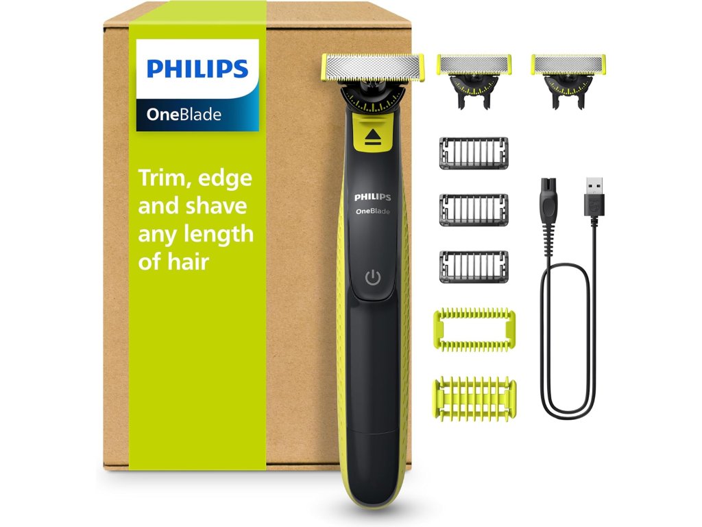 Sada obsahuje: 1x Philips OneBlade 360 Face + Body, 3x břity 360, 4x hřeben na strniště (1, 2, 3, 5 mm), 1x sadu na tělo (1x nasazovací hřeben na tělo a 1x chránič pokožky), 1x ochranný kryt, 1x nabíjecí kabel USB-A, uživatelskou příručku